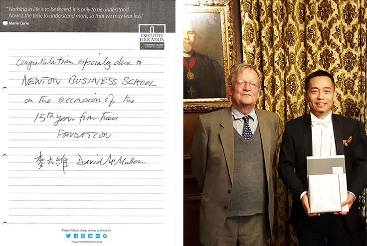 麥大維教授在英國劍橋為香港高等商學院十五周年慶題詞,祝賀香港高等商學院Hong Kong Higher School of Business為亞洲時尚屆培養出眾多傑出人才。
